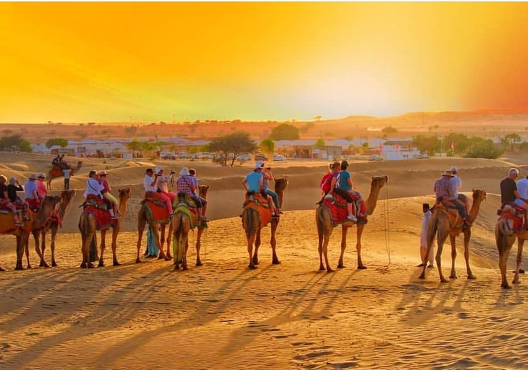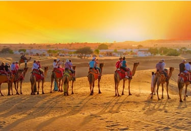 Jaisalmer is a golden desert city known for its massive fort, sand dunes, camel safaris, colorful markets, and unforgettable Rajasthan sunsets.